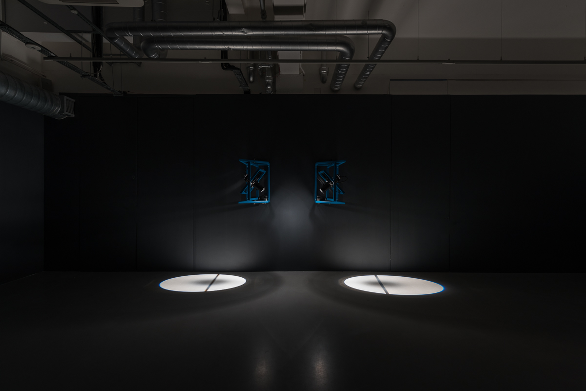 Entering Pilar Corrias, a well-established tease seems to be in play: have they finished installing the show? Of course, they have: the rather Beuysian combination of copper-clad heating circuits on felt packing blankets, together with digital counting units, isthe work; and the door of the cupboard containing the gallery’s electrical switches is open for a reason. New York artist Sam Lewitt is treating the gallery as a computer unit in the copper-coated units maintain the temperature, and those alarm clock displays show its recalibration in response to as vistors’ movements changing it. Global travellers have a parallel collective effect on the wider environment, connecting in turn to what the circuits can just about be seen to spell out, though it’s easier to cheat by looking at the diagrams in the cupboard: the Air B&B slogan ‘Belong Anywhere’. Downstairs, just as interestingly, Texan Lucy Raven meshes surveillance, film history, searchlights, Robert Smithson and institutional scrutiny in a looping rotocaster light projection.