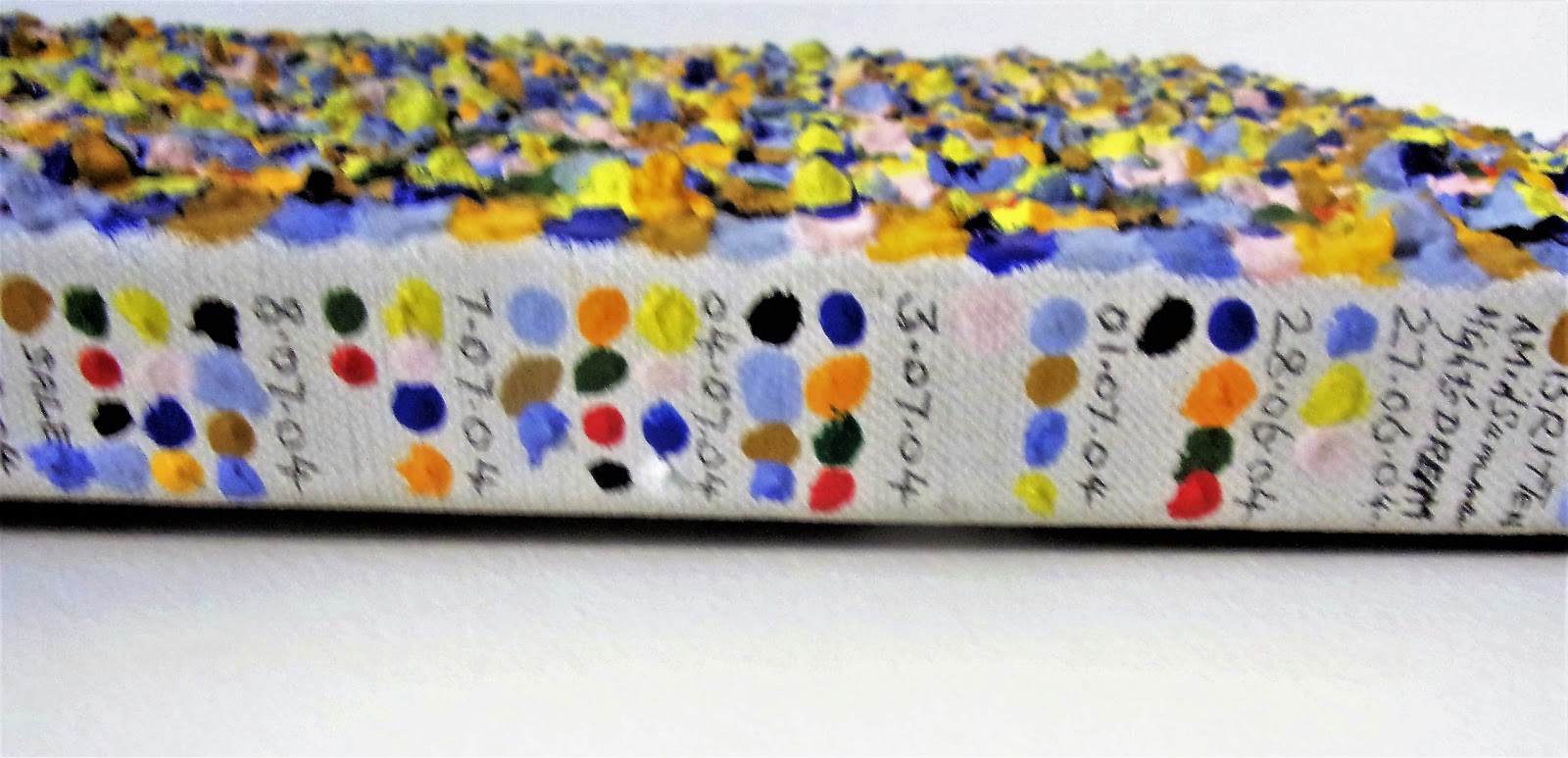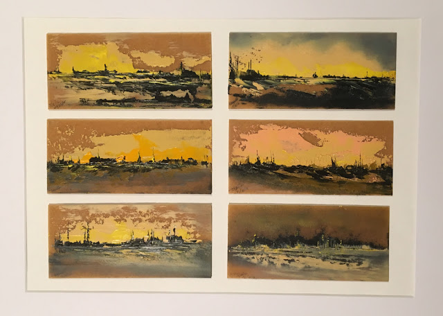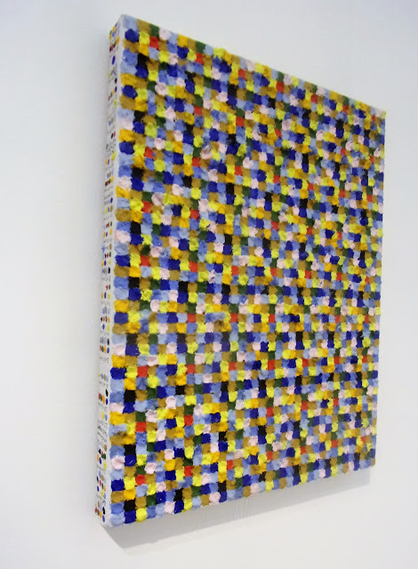 John Hooper’s highly textured chequerboard abstractions emerge from a mixture of rules and intuition: the primary underlying pattern of colour application in the knight’s move from chess, but with exceptions, and the colours derive from his responses to the art he looks at (here August Macke is prominent) and the music he listens to (Benjamin Britten gets a mention), all of which is annotated by date down the side of the painting as he works on it. Beardsmore, incidentally, has joined London’s rent-driven trend towards galleries giving up their permanent space but continuing to operate (see also eg Art First, Jane England, INIVA).