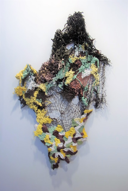 The Zimbabwean artist has found a personal voice at just 22, using his own recipe for silicone infused paint to weave / sculpt /paint semi-disintegrating lattices. They look like tasty abstractions where you might expect political engagement given Zimbabwe’s problems – but Makaza says his foundational shape is the animal hide, and its easy enough to read the works as disrupted maps, damaged viscera or post-traumatic remnants.