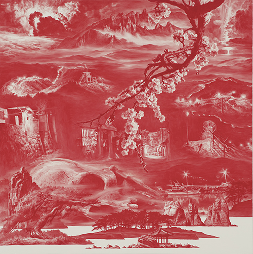 For some years now, Sea Hyun Lee has been painting red-on-white landscapes which collide the natural world with the sociopolitical complications of Korea, the monochrome originating in surveillance photography, the redness in the political and personal. This recent square format example (horizontal panoramas are more typical) poignantly juxtaposes blossom with the Sewol ferry disaster of April 2014, in which 304 people died.
