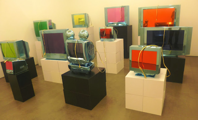 Rob Pruitt, he of the panda paintings, and the traffic cone men at Frieze, has a new show. It’s empty and unoriginal. That’s not, perhaps, enough to drive you to kill yourself (though Pruitt thoughtfully provides a wall for you to jump off, just in case) but why should you enjoy it? Well, even though you’ll have seen the main ideas before – let’s bling up some old TVs to return some value to consumerist redundancy; let’s paint monochromes which vibrate with computer-style colour phasing – you won’t have encountered them executed with such scale and panache. What we have here, in short, is – pace Andy Holden – a perfect demonstration of Maximum Irony! Maximum Sincerity.