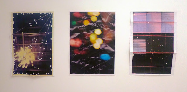 Basel-based Mancunian Clare Kenny is first to show in Vitrine’s new street level space, and she’s already plastered the pristine wall with faux bricks and added a column made of a giant rolled-up photograph. Kenny often makes photographs sculptural, here also folding them, punching holes in them, re-photographing and refolding them as in the city views above, hugging them into boulder-like forms. Other work extends the ways in which things are not what they seem and hints at her experience as a decorator: her spray paintings look like photographs; and iron trellises – from which she hangs neon and a degraded photograph –
