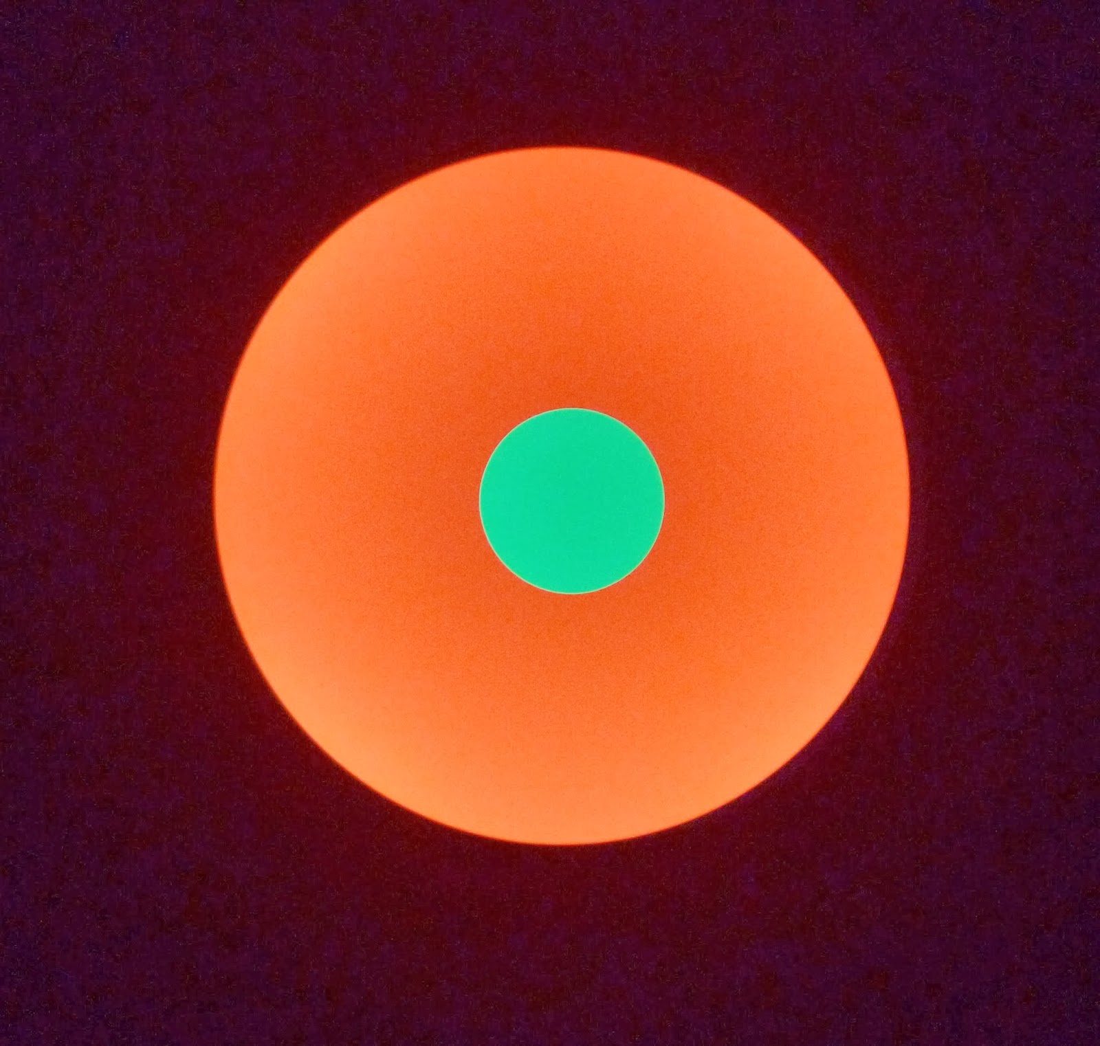 Adam Barker-Mill’s primary set-up here has a computer programme fade up, hold and fade down the LED lamps which illumine an inner circle and outer ring of colours at differential speeds over a 15 minute cycle. The effect’s a sort of mini-Turrell, but with more chromatic range. There’s also a boxier work, through the slats in which blue light alters its intensity as you move past: a Cruz-Diez by other means? Maybe, except that Barker-Mill has come to these meditative colour modulations from a career as a Lighting Cameraman. Two paths to the waterfall…