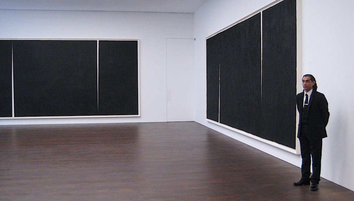 Given the irrepressible human tendency to find metaphors and images even in places were none are intended (Leonardo da Vinci wrote a famous text about this long before the idea of total abstraction in art was invented), it’s maybe not surprising that even works as radically austere as these large black-and-white ‘drawings’ – so-called – at Gagosian tend to summon unintended images to mind. In my case, wickedly frivolous as I probably am to notice it, that of huge blackout curtains imperfectly drawn, with thin triangles of light appearing where the fabric just fails to meet.