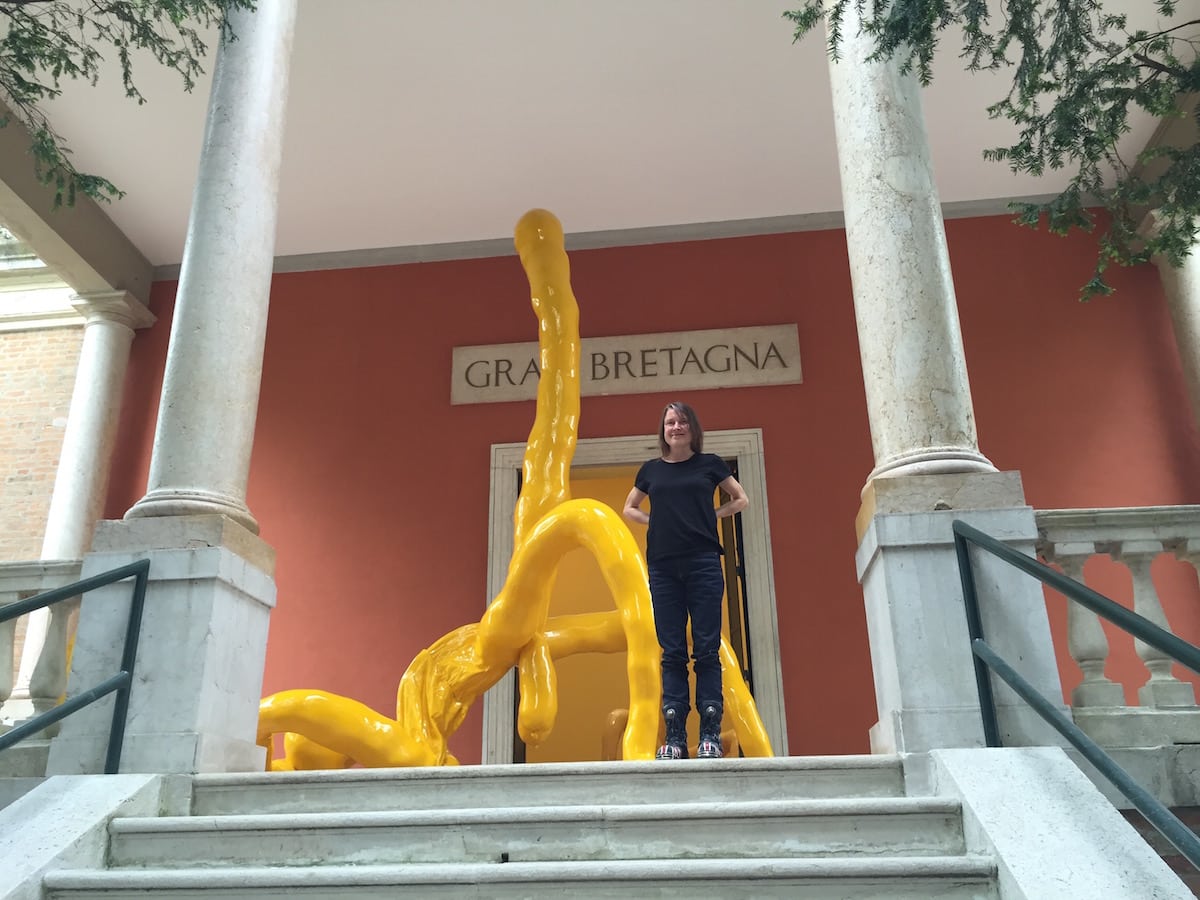 Sarah Lucas unveiled her spectacular yellow pavilion, yesterday, at the Venice Biennale. I SCREAM DADDIO is a new exhibition by the artist who is a seminal part of the YBA group. The installation of sculpture was conceived and created for the British Pavilion at the 56th International Art Exhibition. The after launch was accompanied by a surprise set of music by the iconic Mick Jones formerly of the Punk band the Clash and Big Audio Dynamite.