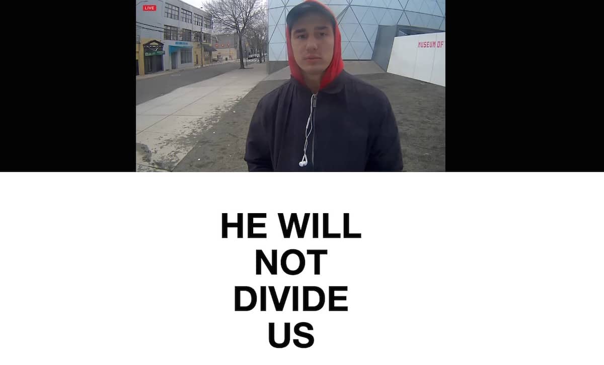 Jaden Smith was the first participant. Smith and a friend in HE WILL NOT DIVIDE US (2017). HE WILL NOT DIVIDE US, Shia LaBeouf is staging a four-year, crowd-sourced protest against the presidency of Donald Trump. Anyone who wants to take part can join by saying the words “He will not divide us” into a camera installed next to the Museum of Moving Image in New York, and live streaming on the internet 24 hours a day. Those who wish to take part can stay in front of the camera for as long as they like, and repeat the phrase. The words “he will not divide us” are meant to become a kind of mantra intended to sink into the subconscious providing solidarity and optimism.