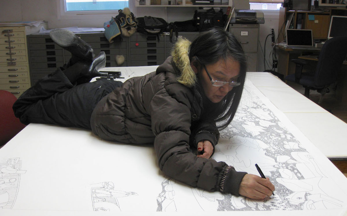 I’ve always worked in pencil crayon, sometimes I use other things, but mostly I work in pencil crayon. I like using them because there are so many colours and I can make some small details in the people or in the landscape. I can go through so many pencil crayons, especially when the drawing is large, so I’m very glad that Kinngait Studios always has lot of them around!