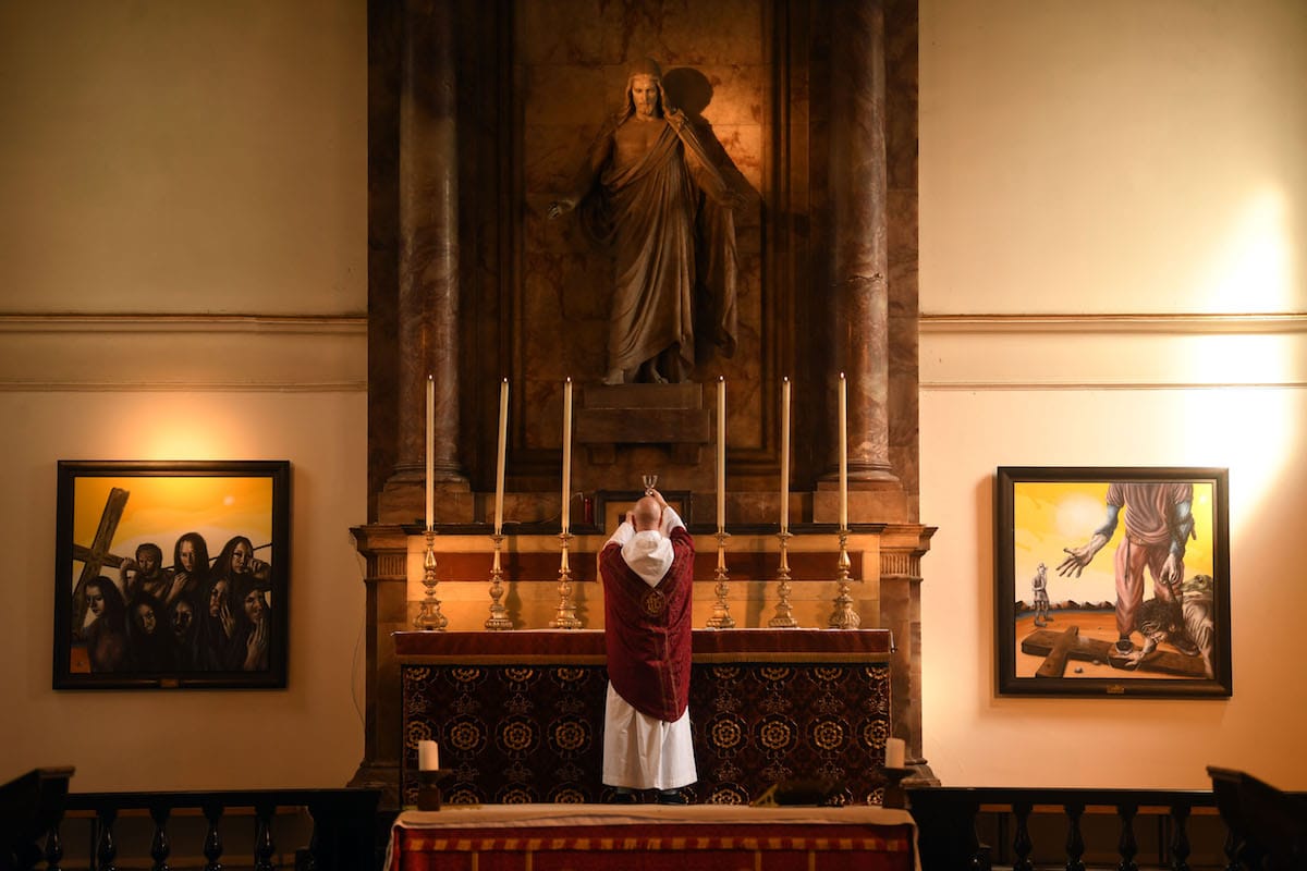 Distinctive and imposing from the outside, the simple interior of this important London landmark is home to a unique commissioned artwork, a site-specific contemporary re-imagining of The Fourteen Stations of The Cross by celebrated British artist Chris Gollon.