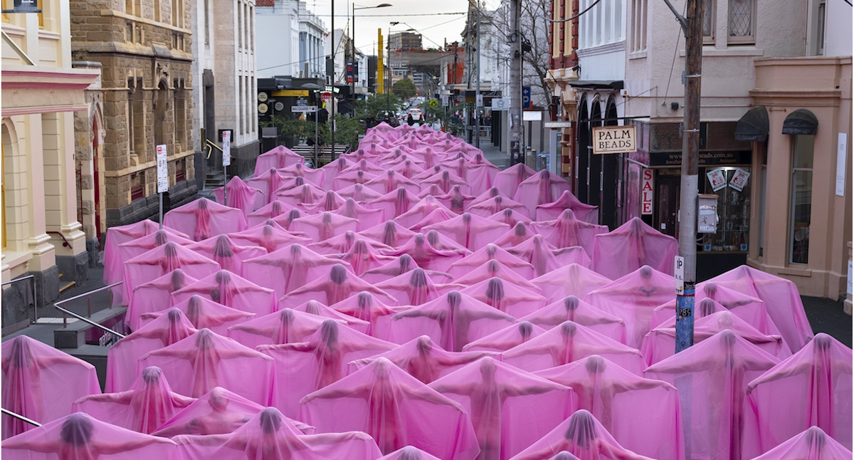 While nudity was a provocative spectacle in the early works, the artist merely perceives it as “the body without clothing.” Consider the hundreds of painted blue bodies in the Sea of Hull, which transforms an anonymous street into an abstract display of a (human) body of water traversing through the city. Nudity is a prop similar to other effects such as fabric, paint, or solar lights; it energetically activates the space.