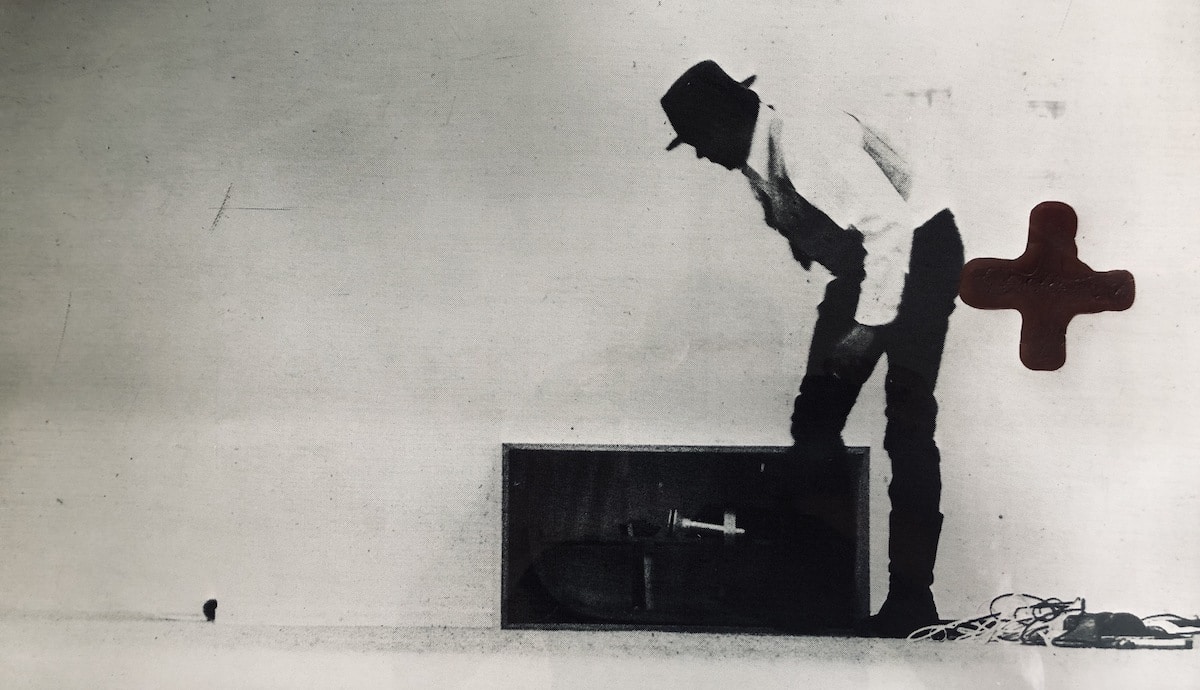 Jim Watkins writes that “Beuys believed that Western society, and particularly Germany, had become spiritually bankrupt” and wounded. “The wound is a potent and pervasive theme” in his work with, for example his environment Show Your Wound (1974) speaking “of death and the possibility of regeneration,” and exhorting Germans to “show your wound.” Pierre-Emmanuel Perrier de la Bâthie suggests that Beuys “then set out to heal the wounds of society by returning to the primordial myth of a freely creative humanity.” In this approach, he: “took up a large number of collective references, including the figure of Christ. He then drew on the symbolic effectiveness of the Christian rite, whether formally – the Cross, for example, became a regular motif in many of his performances, sculpture or drawings – or conceptually – as in the Celtic +∿∿∿∿ action (1971), which he began by washing the feet of seven spectators and ended with his own ‘baptism’. The “spiritual dimension of his acts/actions,” de la Bâthie argues, “should then lead the spectator to take part in the transformation of the modern world.”