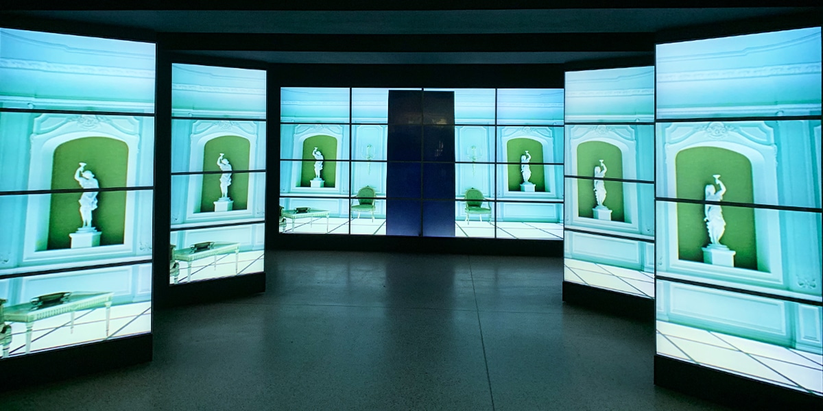 When the visitor steps on the famous orange replica carpet from “The Shining” and walks into the first room filled with large-size video screens, a typical OPP “one-point-perspective” corridor, mirroring Kubrick’s famous camera technique, the exhibition has already crawled up on the visitor.