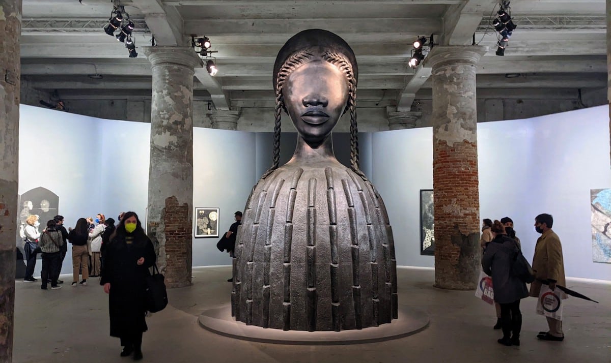 This feeling is compounded in the Arsenale as a monumental sightless sphinx greets us: Simone Leigh’s Brick House; the eyeless bronze head of a black woman emerges from a domed cylinder reminiscent of an earthen dwelling from Chad or Cameroon. Unfortunately, part artefact, part shelter, recalls Hirst’s fake bronze from his critically disastrous show, Treasures from the Wreck of the Unbelievable. Except this bronze is authentic, and the sombre, monochrome works around it are from the late Cuban Belkis Ayon, who tragically never made it to Venice. (Top Photo)