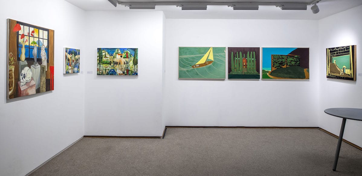 Williams writes that his bather paintings “are about longing and are an emotional space, with an element of what … Gowing termed ‘wish fulfilment’, a phrase I remember he often used in his Slade lectures”. His larger paintings, such as ‘City Dwelling’ and ‘Studio by the Sea’ “depict a collection of objects incorporating spatial displacement and ambiguous juxtapositions; they are like private allegories concerning my own studio spaces, the idea of home and the city at night”. For his method, he uses “a process of addition and revision, balancing figurative elements with a more abstract play with colour and mark making, exploring different paint qualities from impasto to staining in a gradual search for painterly meaning”. His imagery has a variety of sources and he uses “bits and pieces” “constructed with a collage-like aesthetic; pieced together parts are developed through accretion to create a convincing, imaginary painted place”.