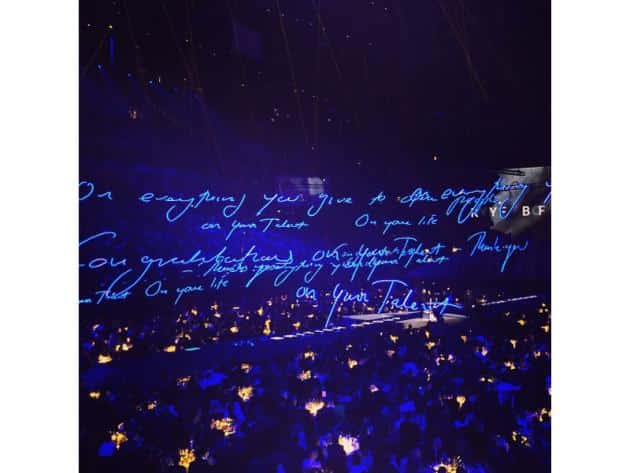 The design for the statuette was unveiled in December, joining the ranks of Vivienne Westwood and fellow Enfant Terrible Damien Hirst. But the artist surprised tonight’s audience with the addition of projected neon text-scenery to London’s O2 Arena.