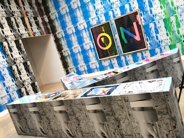 Finally, in sharp, stark contrast, Ciara Phillips’ room installation is an assault of colourful screen printing, literally everywhere. She cheerfully plays around with letters, for as she says, letters generate better discussion than words (whatever that means). “OK” or “ON” are screen printed on posters, made into sculptures like a gigantic “K” as a sort of display cabinet for imagery. A curvilinear structure resembling an “O” if it is seen from above, where the sectioned fragment is an entryway into the structure, also wallpapered with her screen prints, and proposes topics of “things to discuss” like money, or fractals or rubbish. The rest of the room is covered from floor to ceiling with colorful screenprints whose forms are developed from abstract marks, ink splodges, and geometric shapes, emphasizing play, chance, repetition and even mistakes. In a word, she goes mental with her medium and like a kid on a sugar high, she churns out a multitude of possibilities. It’s joyful and physical and a bit of a breath of fresh air because it reminds us of what artists used to do in their studios.