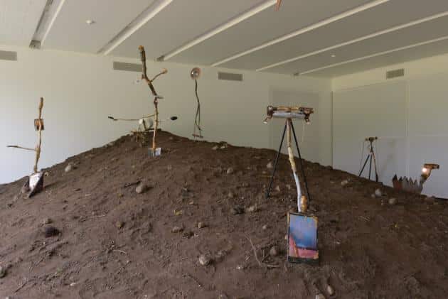 “Burrow Me”, a 2009 work on view in the show, becomes a central component around which a larger narrative is developed and realized. The work follows the steps of Prouvost’s grandfather, a conceptual artist who went missing some 20 years ago, and for whom the artist has been looking ever since. The exhibition invites us to join Prouvost in her ongoing search for her granddad through a human-sized burrow that has been dug in the green outside Rupert. Utilizing elemental material found in her home and inside the earth, the artist built shovels, which she then used to dig into the ground. Among others, a “GPS Shovel”, a “4 Step Shovel”, a “Sexy Shovel”, a “Reading Shovel” and a “Drunk Shovel” then found themselves digging into city land whilst orienting, satiating, nourishing and intoxicating their digger. When all was done, the earth that had been dug out and the now tired shovels were put to sleep in the gallery, where visitors are invited to partake in the digging.