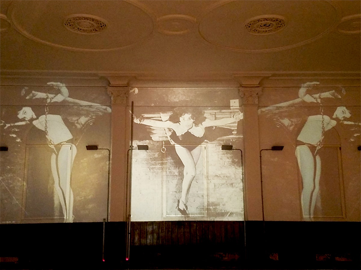 The extraordinary performance costumes, ‘Fetish Totem’ by Laura Shepherd and ‘Fetish Totem 2’ by Lyall Hakaraia are suspended, like beguiling and slightly unsettling creatures from the ceiling of the first gallery space. A wall of assorted flyers, Jonas Ransom’s hypnotic ‘Yellow Snake’ wallpaper, and a “lost and found” clothes rail dazzle in the central part of the gallery space. The pink fluorescent light, illuminating the final room, its walls covered with photographs, brings us deep into the atmosphere of club culture. Here the visitor is invited to add to the work by adding their messages to the walls with post-it notes.