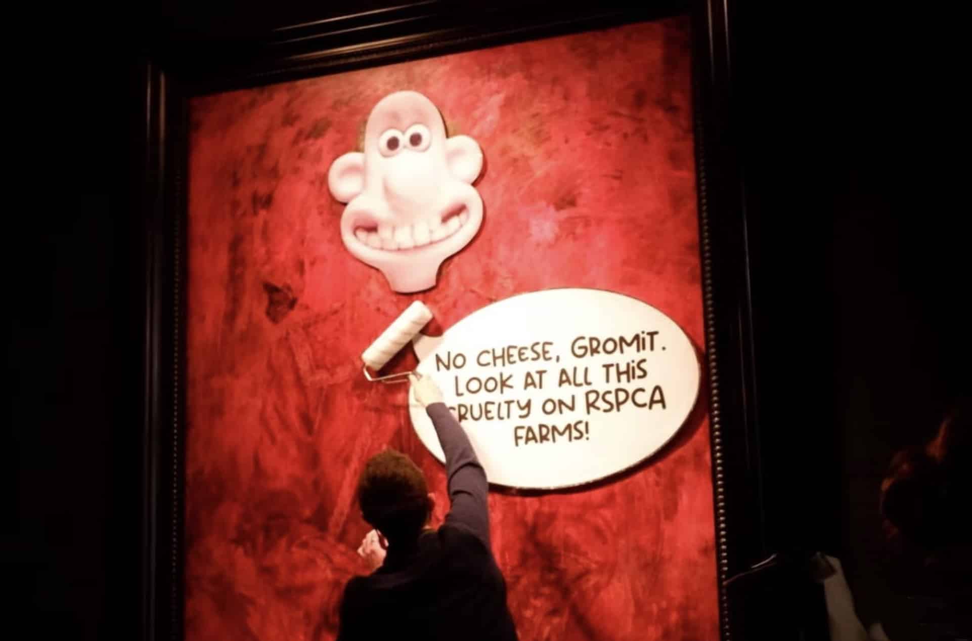 Jonathan Yeo’s ‘red’ portrait of King Charles III was vandalised during a protest by animal rights activists at the Philip Mould Gallery in the west end of London. The protesters replaced the King’s face with Wallace from Wallace and Gromit, adding a speech bubble that read, “No cheese, Gromit. Look at all this cruelty on RSPCA farms!”