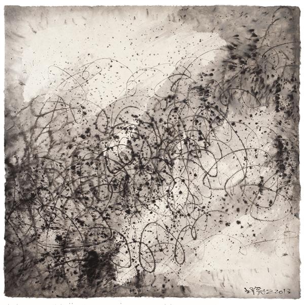 The Chinese Literati artists used the same inks, brushes and basic strokes to render the still more detailed descriptions of the world that we recognise as representational paintings, the majority of which would also contain a written poem. Here, in his Moving Visions Series, working primarily with a single unbroken line, Wang Huangsheng breaks beyond the fixed conventions of traditional brushstroke painting, returning in a radical manner to an ‘uncivilised’ world preceding language. The cursive line roaming the paper’s field suggests the potential of that unanimous world of nature existing just out of the reach of words. These aleatory abstractions suggest another world, one free of the boundaries limiting consciousness with discrete definitions. Wang Huangsheng’s poised brush, freed from all restraint of the conscious mind, becomes an instrument to channel the unwinding silken thread of the wider world’s immanent consciousness. Ever the poet, the artist describes that spontaneous sense of freedom expressed in these moving lines as being like that of: “a boat floating without anchor into the infinite emptiness.”