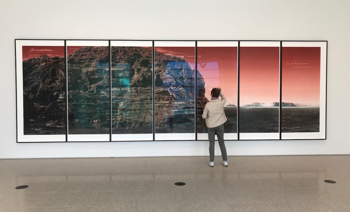 At its much bigger space nearby in Grosvenor Hill, Gagosian offers a more ambitious show by a much younger American artist, Alex Israel (b. 1982), who lives and works in Los Angeles, which currently has a much livelier art scene than New York. Entitled ”Always on My Mind’, the show consists of a series of paintings on fiberglass. The pictures are all self-portraits and are all painted on grounds shaped as the silhouettes of profile heads. The images usually portray the urban scenery of Los Angeles – Mulholland Drive, Santa Monica Pier, Chinese Theatre, Griffith Observatory. They occasionally record the presence of a friend – Eli Study, for example. And sometimes they are just generic – Stained Glass, Wheel of Fortune. The results are certainly elegant, but also a little flat. Two-dimensional in the wrong way. You are left with the impression that the artist can only carry one thing at a time within his head. On the other hands, you certainly can’t quarrel with the finesse of the execution.