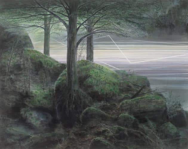 Born in Efurt, Germany in 1981, Wieland Payer is best known for his intricate drawings in charcoal and pastel depicting mountains and woodland. His work originates from close dialogue with German Romanticism, being concerned with the monumental presence of natural phenomena. Payer’s landscapes contain abstract geometric objects and are full of visual paradoxes that remove them from the realm of actual experience.