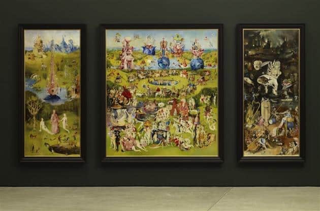 Four massive triptychs predominate the gallery space – two in pencil, two in oil; two depict the most famous of Bosch’s work The Garden of Earthly Delights, two replicate The Haywain. All four images at first glance appear remarkably similar – the large centre space represents the mortal world with the garden of Eden to the left and Hell on the right. This sort of dichotomous iconology reflects the basic preaching of Christian faith: one’s actions on earth determine the bliss or terror of the afterlife.