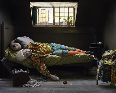 The main gallery will feature a series of five new photoworks entitled Fake Death Pictures. The artist refers to this series as “a re-enactment of suicide through the history of death in Painting.” Shonibare imagines a dramatized vision of the tragic event of Nelson’s death as played out over a series of five photographic allegories based on classic scenes in painting. The series brings together painting, stage design and photography to create works in the manner of The Suicide by Leonardo Alenza y Nieto (1839) and Edward Manet, (1877) and The Death of Chatterton by Henry Wallis (1856), Death of St. Frances by Bartolomé Carducho (1593) and Death of Leonardo da Vinci by François-Guillaume Ménageot (1781).