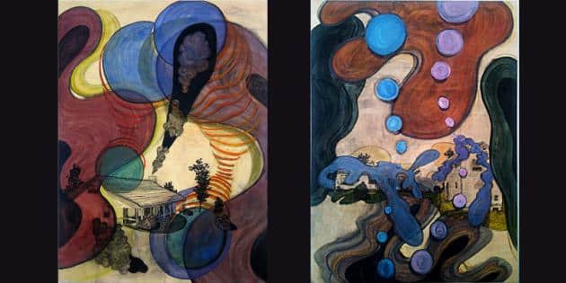 Her large paintings take this further and she creates complex layers, working on large wood panels. She likes the way the brushes “scratch” the hard surface, allowing her to draw with paint. Her amazing colour palette enhances the fantasy element of her landscapes that explore a virtual kingdom, on the edge of abstraction.